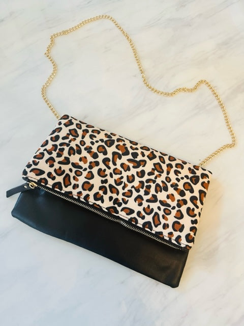 This crossbody comes in two styles: leopard and snakeskin (pink); beautiful zipper entry with zipper inside as well. This can be worn as a clutch or double as a crossbody given a beautiful chain strap that can be removed.