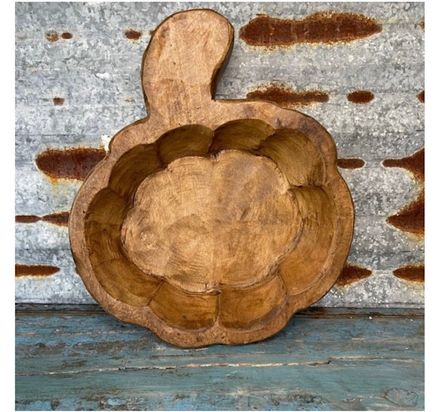 Our large pumpkin dough bowls will bring the fall spice to any room! These are hand carved from Spanish Oak. These are made to look rustic as they are hand carved and sealed. These make wonderful table bowls, foyer entry bowls, window decorations, outdoor patio decoration, candle holder. and so much more! This bowl, filled with beautiful goodies could be an amazing centepiece for the season - and all year long! Throw in some favorites and wrap with a beautiful bow for a hostess gift! The ideas are endless and these bowls are perfection!