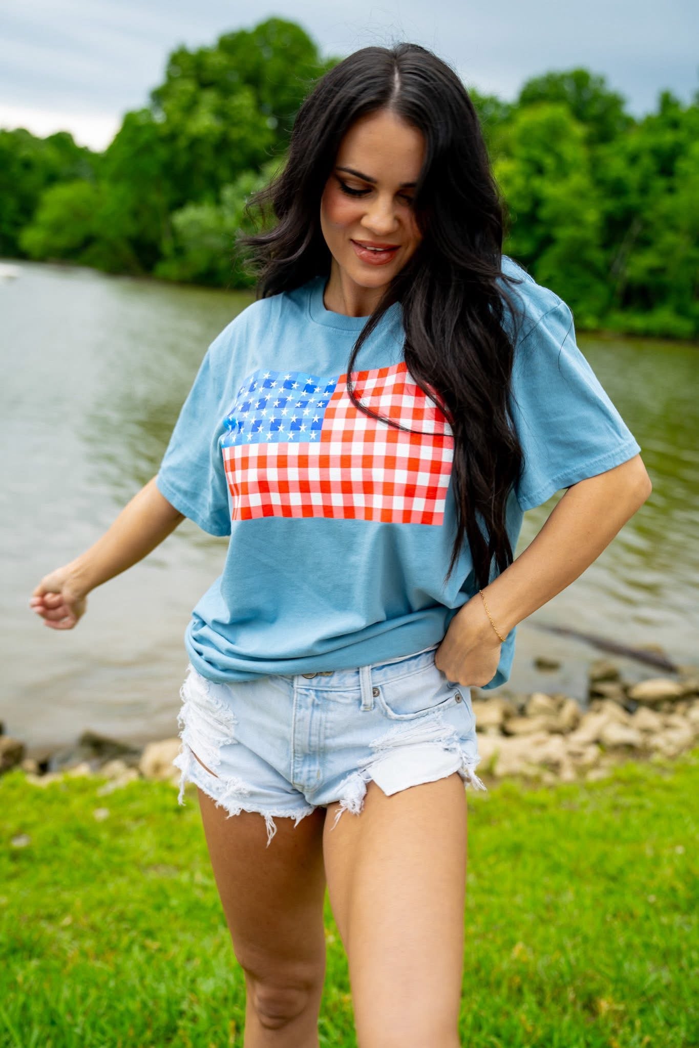 Do you need that perfect throw and go American inspired shirt to wear all summer long? Our picnic flag with stars blue tshirt is the perfect option! With a super soft tshirt material and beautiful patchwork design, we loveee this one for allll summer long!