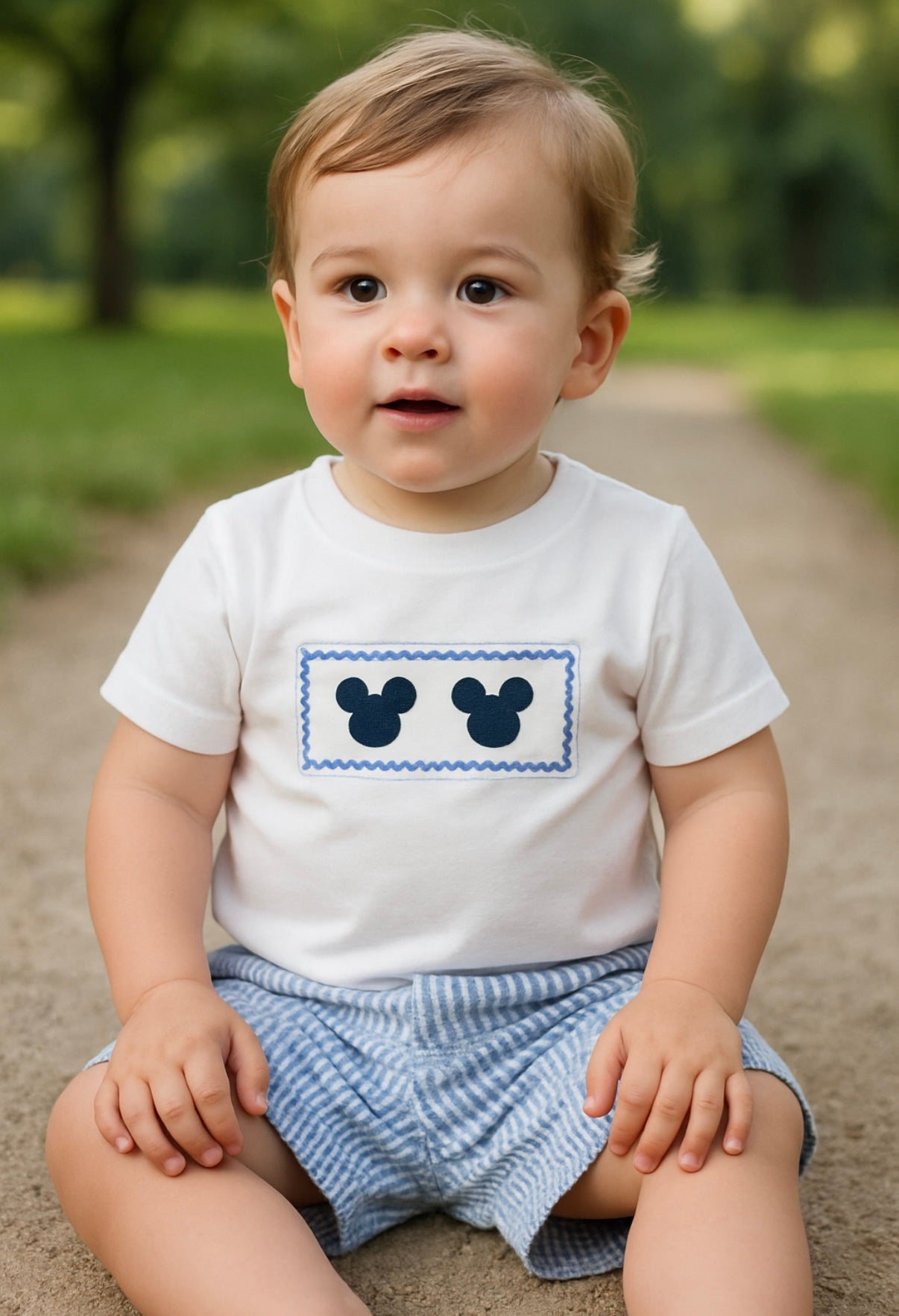 We are EARS over heels in love with this adorable boys' short set! The classic blue and white smocking detail is perfection! The shorts are blue and white seersucker matching perfectly with the blue and white stitching in the perfect stretchy and breathable tshirt made of our most super soft knit material. The fitting on this option is true to size.