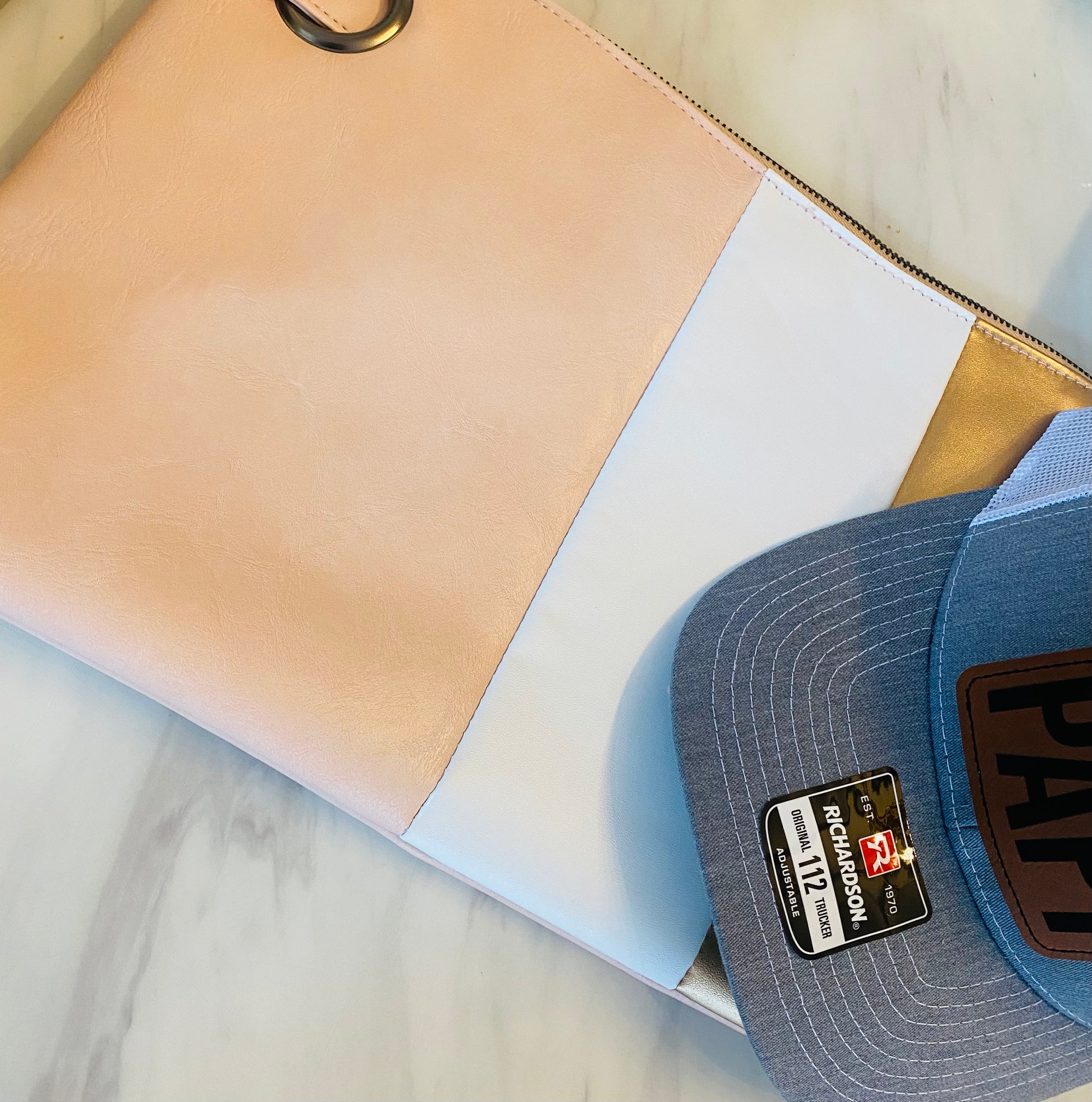 Beautiful pink, cream and rose gold clutch! With multiple pockets and a zipper inside, as well as a zipper entry and long clutch handle, this bag is perfection!